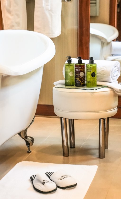2. Pod koniec 2024 roku dokonaliśmy kolejnego kroku i wprowadziliśmy w miejsce mini kosmetyków łazienkowych opakowania wielorazowego użytku (typu refill), które napełniamy przed przybyciem gości.